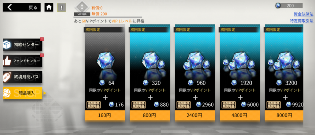 「終境シンフォニー」の課金要素として「暗晶」があり、最安値160円で購入可能です。