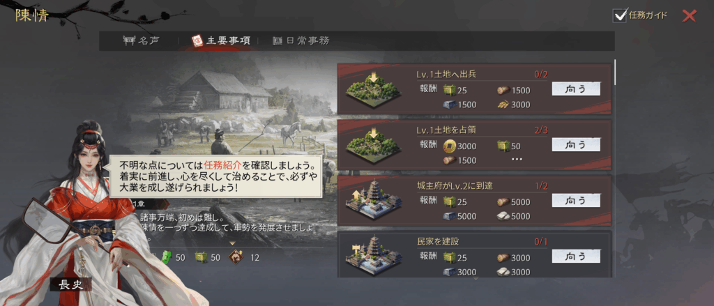序盤では主にメイン任務を進めていくことになりますが、同時に城主府レベルも上げていかなければなりません。
