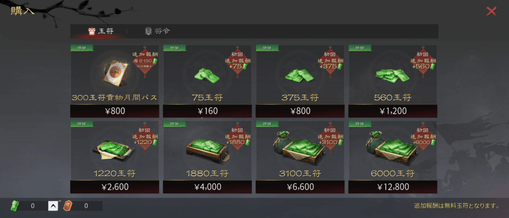 「率土之濱-大三国志」の課金要素として「玉符」があり、最安値160円で購入可能です。