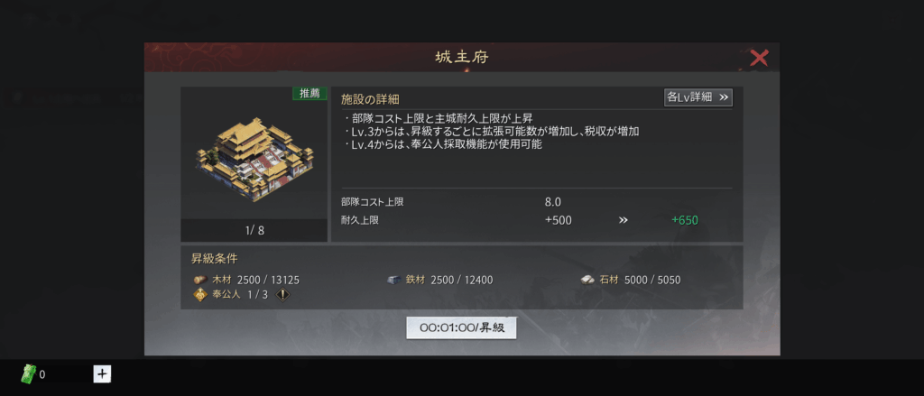 つまり、効率的に戦力を上げたい場合は城主府のレベルを優先的に上げていくことが必要です。