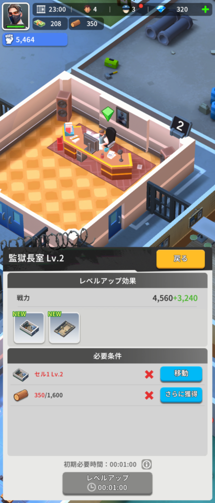 中庭や看守室のレベルを3まで上げたくても、監獄長室のレベルが2のままだと中庭や看守室のレベルが2までしか上がりません。