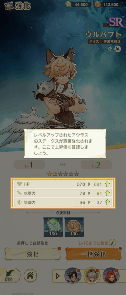序盤ではレベルアップにつながる「強化」を行い、成長限界ギリギリ(初期ではレベル20)まで強化を行っておくと序盤攻略のステージは楽に進められます。