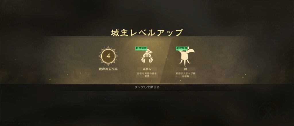 城主レベルを上げていくと、絆やスキンなどのコンテンツが開放されていきます。